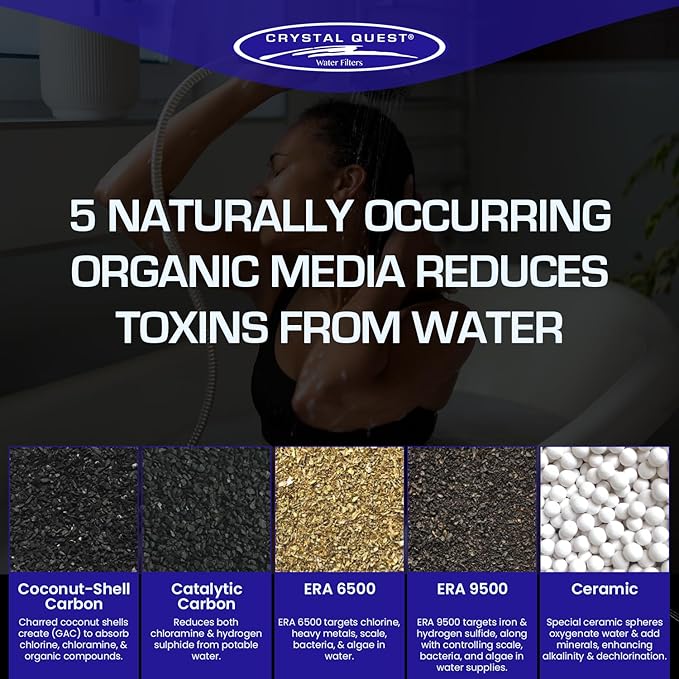 - 𝐑𝐞𝐦𝐨𝐯𝐞𝐬 𝐇𝐚𝐫𝐦𝐟𝐮𝐥 𝐂𝐨𝐧𝐭𝐚𝐦𝐢𝐧𝐚𝐧𝐭𝐬 𝐟𝐨𝐫 𝐚 𝐇𝐞𝐚𝐥𝐭𝐡𝐢𝐞𝐫 𝐒𝐡𝐨𝐰𝐞𝐫: Effectively removes chlorine, chloramines, VOCs, THMs, sulfur, heavy metals, hydrogen sulfide (rotten egg odor), iron oxides (rust water), dirt, sediment, and other unpleasant odors. Water is pH balanced and filtered through ERA-6500, ERA-9500, and Coconut Shell Granular Activated Carbon for the most refreshing shower experience.