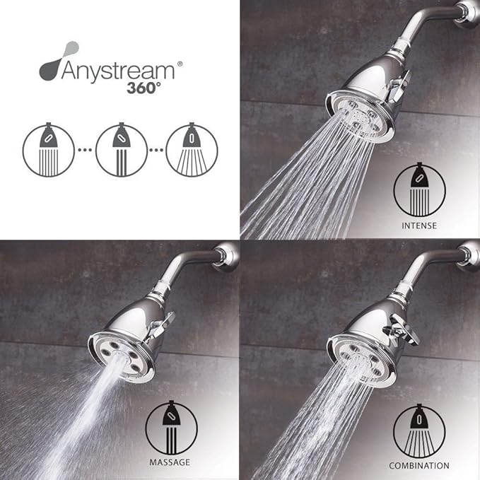 - ANYSTREAM TECHNOLOGY: The adjustable shower head’s patented Anystream 360° system effortlessly transitions through Intense, Massage and Combination settings, evenly distributing water.