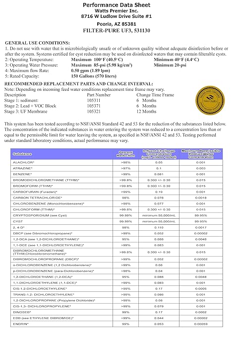 - QUALITY CONSTRUCTION: With a maximum operating pressure of 85 psi, the included WQA certified filters are crafted from high-quality materials for maximum filtration. We recommend replacing pre-filters every 6 months and the UF membrane every 12 months.