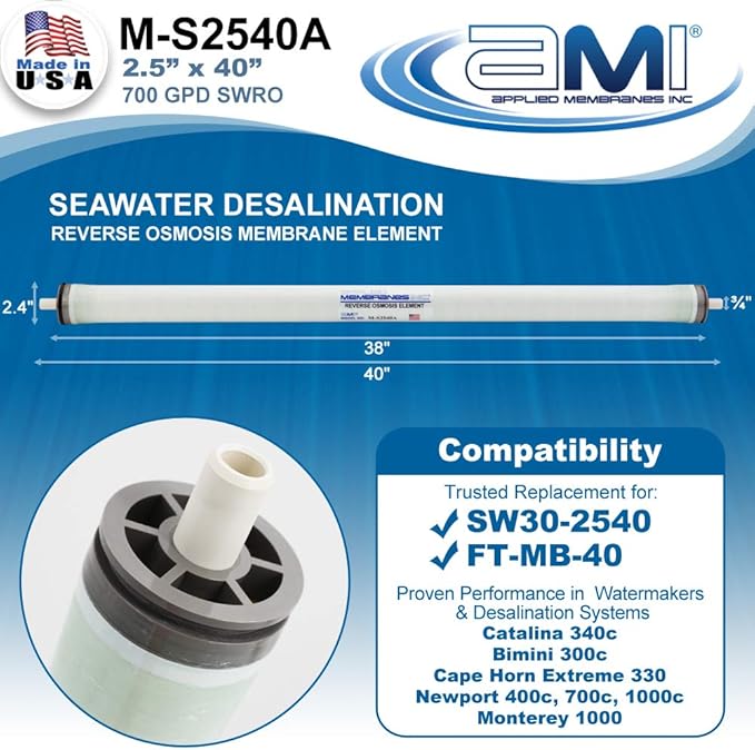 - Designed for use in Watermakers and Desalination systems including Catalina 340c, Bimini 300c, Cape Horn Extreme 330, Newport 400c, Newport 700c, Newport 1000c, Monterey 1000 and any system using standard 2.5 x 40 seawater membranes.