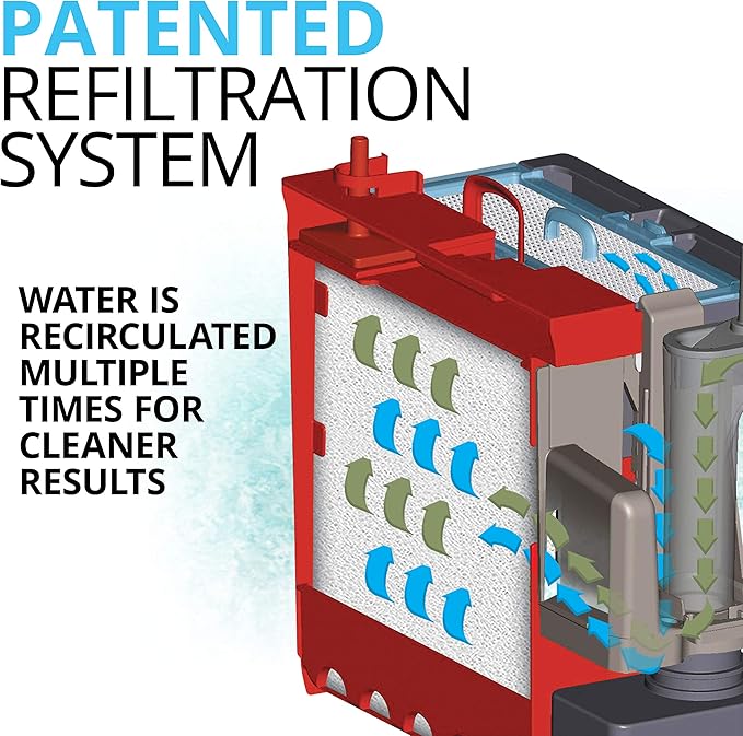 - Two mechanical stages trap large and fine debris, foams easily slide out for quick cleaning