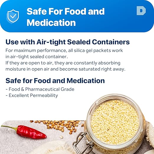 - [How To Use] Place your items and silica gel packets in a tightly sealed container to protect your items from moisture damage; Use silica gel packs to protect Foods, Medications, Vitamins, Seeds, Nuts, Snacks, Cookies, Spices, Pet Foods, 3D Filaments, Safes, Guns, Ammos, Canister, Collectables, Jewelry, Documents, Camera Lens, Clothes, Cosmetics, Books, Bags, Decorations, Wet phones, Cameras, Watches, Electronics, Shoes, and Many Other Valuables