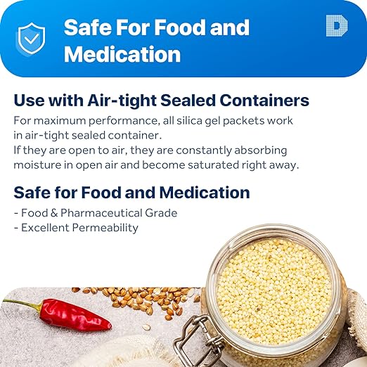 - [How To Use] Place your items and silica gel packets in a tightly sealed container to protect your items from moisture damage; Use silica gel packs to protect Foods, Medications, Vitamins, Seeds, Nuts, Snacks, Cookies, Spices, Pet Foods, 3D Filaments, Safes, Guns, Ammos, Canister, Collectables, Jewelry, Documents, Camera Lens, Clothes, Cosmetics, Books, Bags, Decorations, Wet phones, Cameras, Watches, Electronics, Shoes, and Many Other Valuables