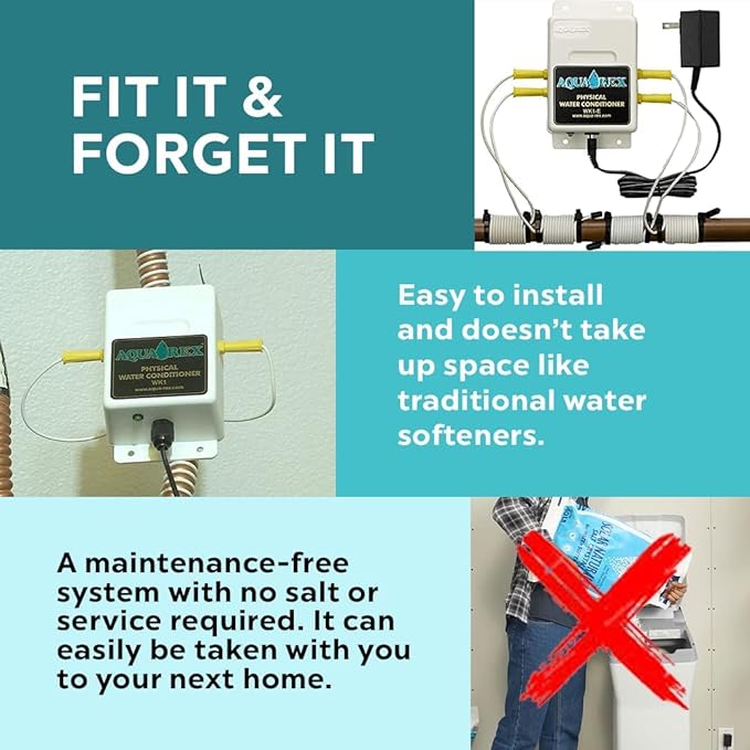 - EASY INSTALL AND MAINTENANCE-FREE: Aqua-Rex uses no salt and is easy to install. No plumbing knowledge needed nor pipes to cut. Just plug-and-play. And if you are a renter, you can easily remove it and take it with you.