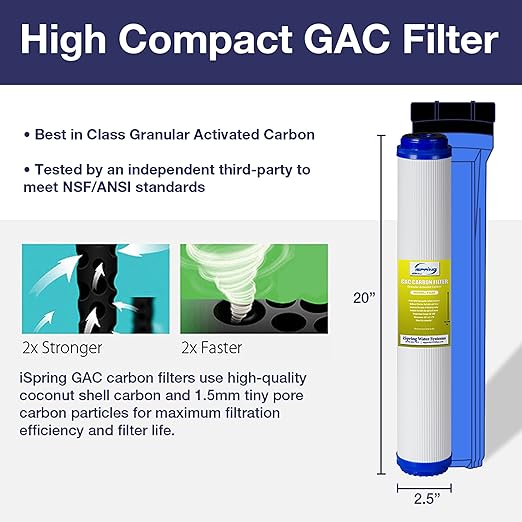 - Water flow rate of up to 12 GPM; fits iSpring RCB3P and WCB32C-GAC water filter systems, and any standard water filter housings requiring 20β x 2.5β cartridges.