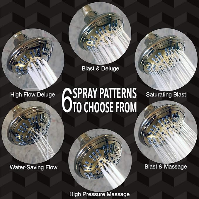 - π¦ NO MORE DEALING WITH shower heads that barely trickle out water or needle your skin with thin streams or peel your skin off with excess pressure. PICK YOUR FAVORITE of 6 DIFFERENT SETTINGS: a traditional firm spray, a pulsating blast to massage your skin, a low pressure deluge to quickly rinse hair, a water-saving flow while shaving, and 2 mixed modes to dial in YOUR PERFECT COMBINATION.