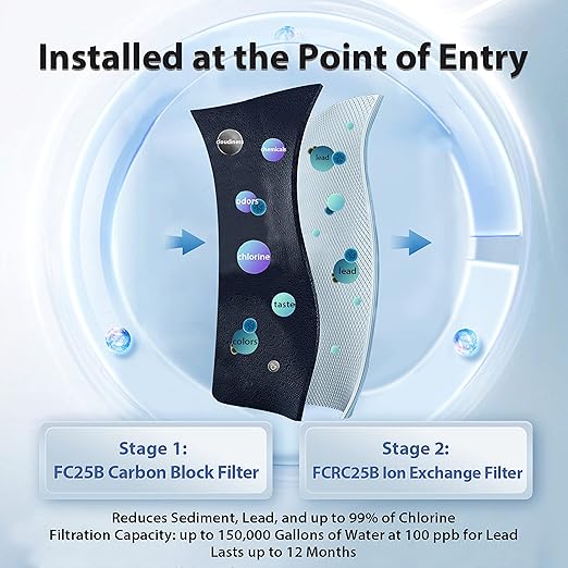 - Whole House Water Filter that Protect Your Family and Household Appliance from Lead and More: Our 2nd stage lead removal water filter (FCRC25B) is specially designed for reducing lead. This whole house filter features a high capacity of 150,000 gallons of water filtration at 100ppb for lead. The whole home water filter system also removes sediment, chlorine, rust, herbicides, industrial solvents, and various other contaminants.