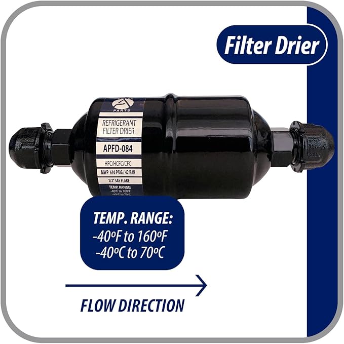 Appli Parts APFD-084 1/2 in Liquid Line Refrigerant AC Filter Drier hvac Refrigeration 084 SAE Flare connection universal unidirectional 6in long 2 in wide