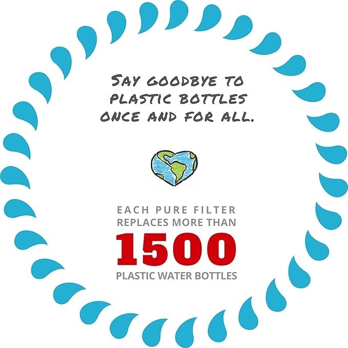 - Eco-friendly and cost-effective solution: Each filter purifies 150 gallons (568 liters) of water, drastically reducing the need for single-use plastic bottles and saving money in the long run. Our filters are 100% recyclable through our recycling program, further minimizing environmental impact.