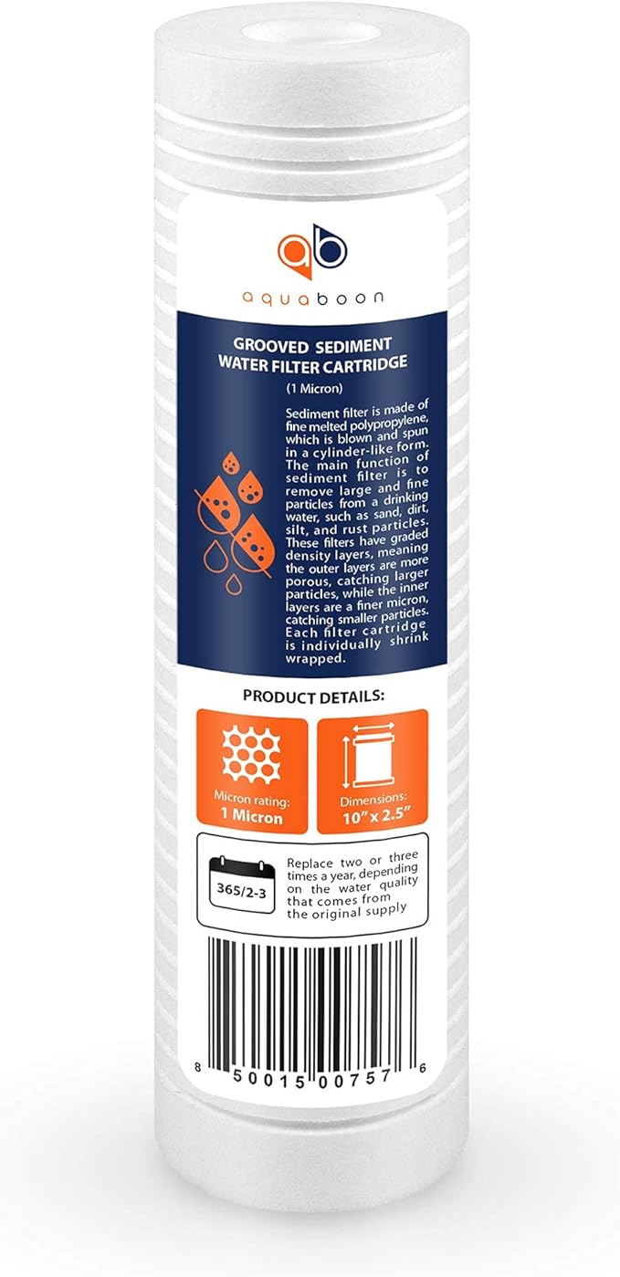 Aquaboon Whole House 1 Micron 10 x 2.5 PP Grooved Sediment Water Filter Cartridge Replacement Compatible with AP110, WHKF-GD05, CFS110, P5, 6-Pack