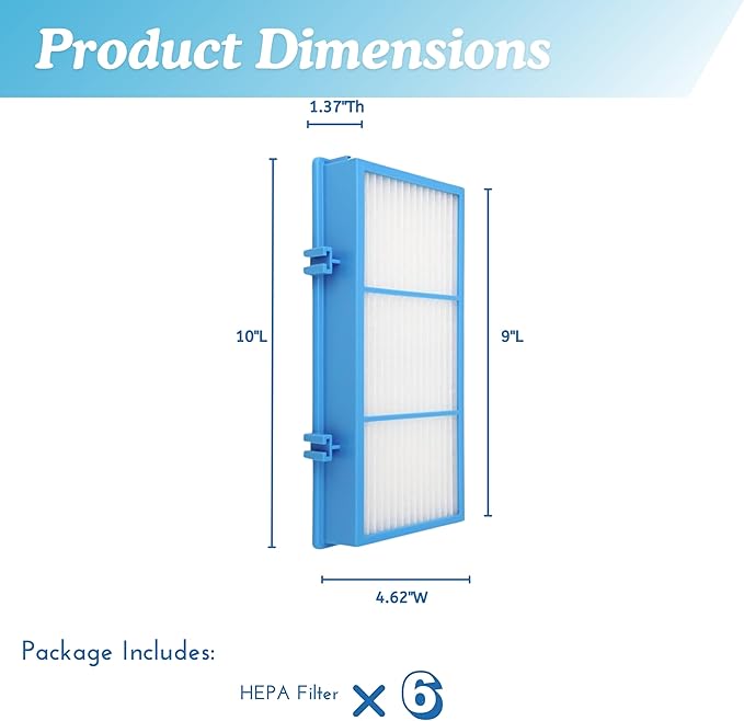 - Filter dimension: 1.2 x 10 x 4.6 inches. 6 HEPA included. We recommend replacing your air purifier filters every 6 months to maintain effectiveness and efficiency.