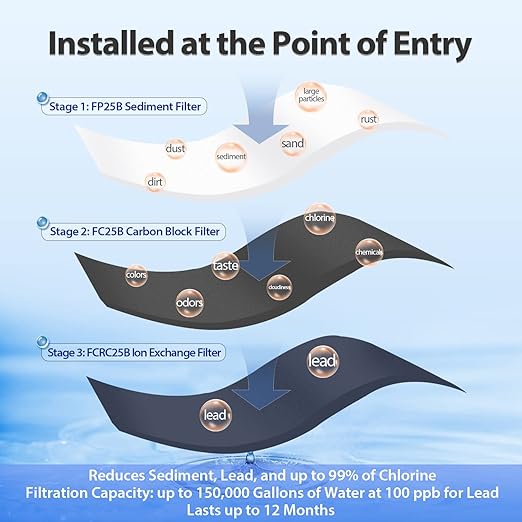 - Protect your family from lead and more: WGB32B-PB whole house water filter is specially designed for reducing lead. Our 3rd stage FCRC25B lead removal filter features a high capacity of 150,000 gallons of water filtration at 100ppb for lead.