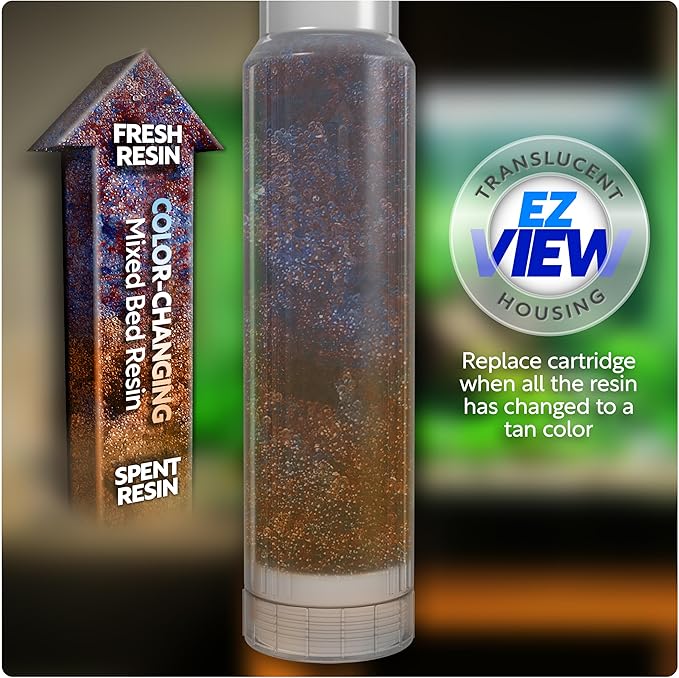 - EASY MONITORING - This deionized water filter system includes two clear canisters and two deionization water filter cartridges that make it simple to view the color-changing resin. When the resin changes from blue to tan, itβs time for a replacement.