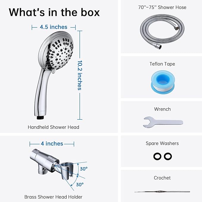 - ►PACKAGE INCLUDES: Handheld Shower Head, Brass Shower Head Holder, 70"~75" Shower Hose, Teflon Tape, Wrench, Crochet and Spare Washers