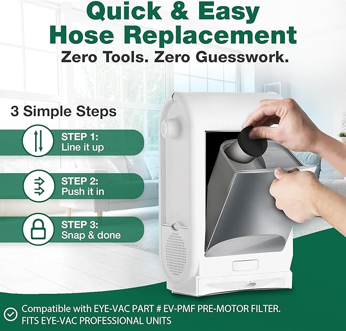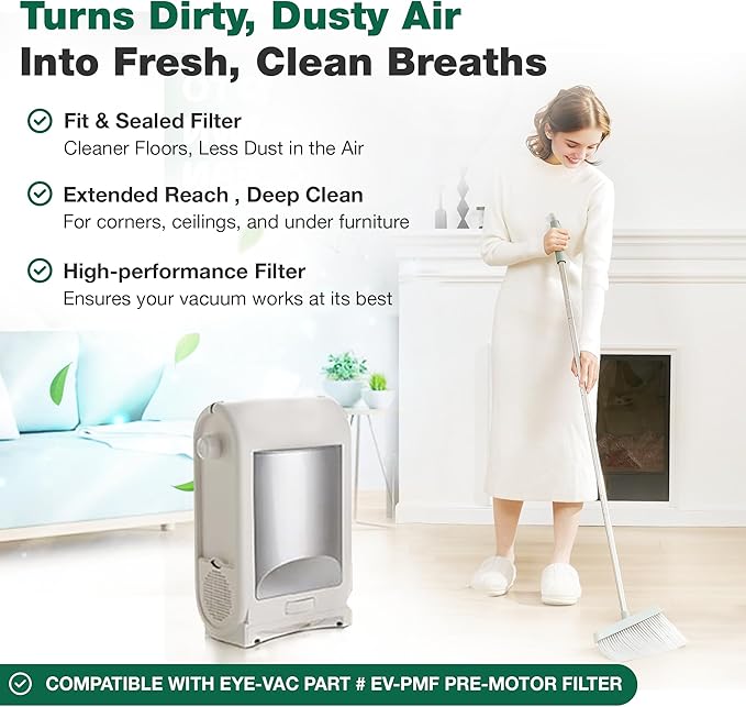 - 1 PACK OF REPLACEMENT VACUUM FILTER COMPATIBLE WITH EYE-VAC PART # EV-PMF PRE-MOTOR FILTER. FITS EYE-VAC PROFESSIONAL UNITS. Get back to having a clean air to breathe again!