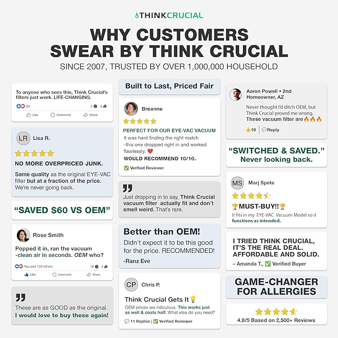 - THINK CRUCIAL manufactures premium quality replacement parts and stands behind the quality and workmanship of all our products. We maintain a thorough quality control process to ensure compatibility with Eye-Vac filter parts and models listed above.