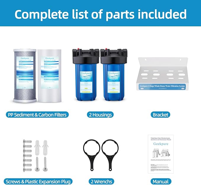 - 10 Inch clear whole house water filter housing,1"NPT inlet/outlet and brass thread,with pressure release button for high flow,plastic wrench and metal bracket.Housing only, filter cartridges are sold separately