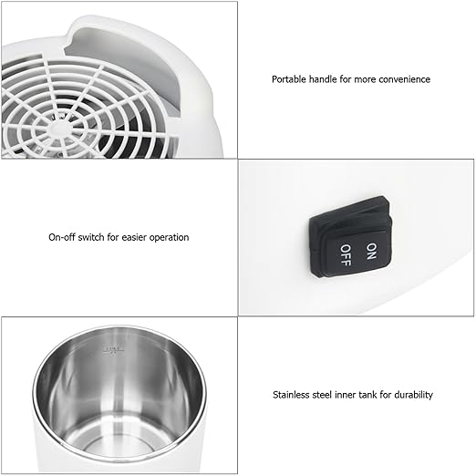 - FAIR QUALITY: Body upgraded with flame-retardant material. 100% 304 stainless steel Inner tank / Inner cap / Water outlet / Water inlet, Aluminum fan, 6L Plastic Container with handle. All materials are food grade.