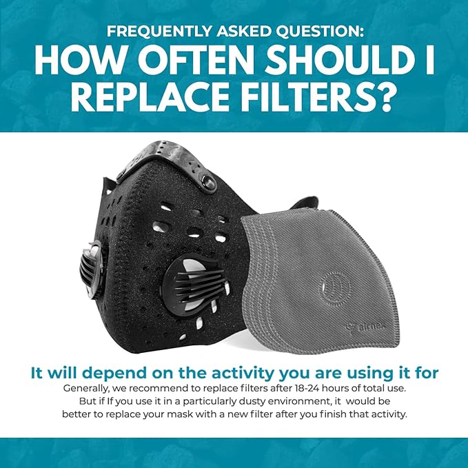 - CONVENIENT REPLACEABLE DESIGN: Each filter mask replacement includes 10 carbon filters and 4 exhaust valves. For optimal protection from pollution and airborne contaminants, replace your mask liner filter every 2-3 days or after 18-24 hours of total use.