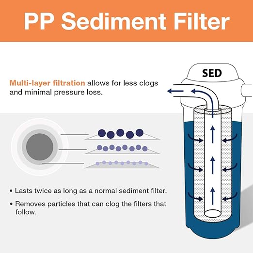 - Top-Notch Quality: The first stage high capacity sediment filter is able to achieve filtration down to 5 microns. The second and third stage CTO Carbon Block filters are made of high-quality coconut shell carbon for maximum filtration efficiency and filter life. Both are tested by an independent third-party to meet NSF/ANSI standards. Both filters have a capacity of 30, 000 gallons of water, enough to supply a family of four with clean water for half a year (depending on your water quality)