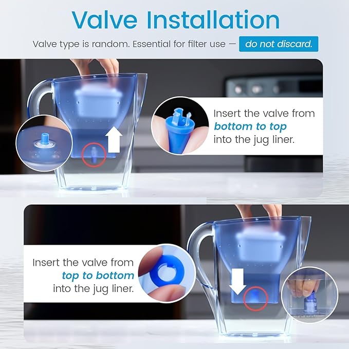 - Easy Installation for Effective Filtration: Before use, check your jug's liner type. If it has a flow restrictor, insert the included blue valve as instructed; if not, simply skip this step. To install, locate the flow restrictor at the bottom of the jug liner and insert the valve prongs into the three holes for optimal performance.