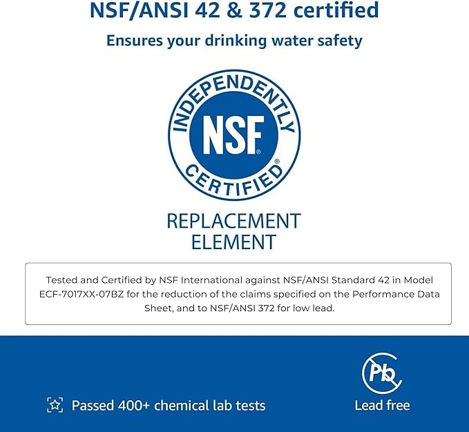 - NSF Certified & Food-Grade Material: The AQUACREST filter is NSF 372 certified for its lead-free material and is also certified against NSF/ANSI/CAN 372 standards to ensure effective reduction of chlorine, unpleasant taste, and odor. Made with exclusive food-grade materials, it provides BPA-free filtration so you can feel confident that every sip of water from your AQUACREST filter is clean and safe.