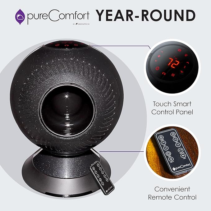 - Powerful, Whisper-Quiet Heater and Cooling Fan: pureComfort YEAR-ROUND combines a heater and a fan so it can heat or cool your space, depending on the season. For winter, it's a 1,500-watt positive temperature coefficient (PTC) heater with a strong air flow, and for summer, it circulates air throughout the room.