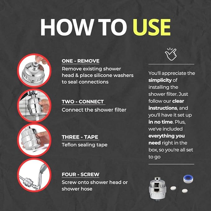 - Vitamin C 15 STAGE FILTRATION : Enhanced KDF-55 purify shower water and shower filter for hard water and eliminate chloramine fluoride and chlorine, heavy metals, bacteria, pesticides etc. The Vitamin C nourishes skin with natural moisturizers and minimizes skin dryness. The Maifan stone are formulated to maintain a body’s natural PH.
