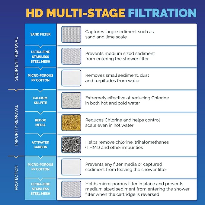 - Actual Heavy Duty Filtration - 48% Denser Media: Our top selling inline shower head filter is now even better. Cleverly engineered to maximize the space with 48% more shower media, this is the shower water filter to get if you want to make every shower a refreshing, cleansing experience free from the dirt, scale, bad odors, rust, chemicals, chlorine & toxins that otherwise ruin your scalp, hair, nails & skin.
