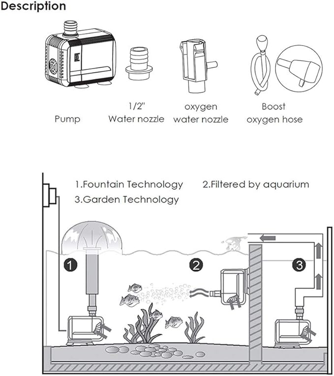 - High Efficiency - The water pump for aquarium is equipped with 1 water nozzle (13mm) and one aeration nozzle and one air tube (1.5m). The water pump also has a higher discharge height, the maximum height is 2.63ft / 0.8 meters. Voltage: AC110V-120V. Power: 6W