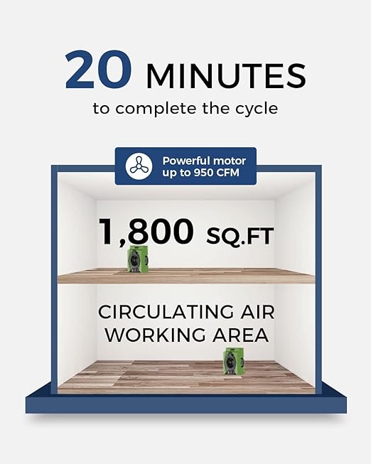 - Powerful and Convenient: Compact yet powerful carpet air mover fan with air flow 950 CFM and maxima current only 1.8 amps. Daisy chain up to 8 fans on a single 15 amp circuit, this allows the user to operate more equipment while creating a dynamic drying vortex, hour meter, stackable, LCD display, variable speed.