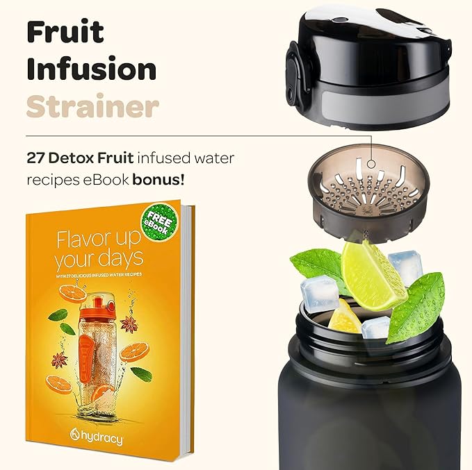 - 👍SMART DESIGN Equipped with a detachable travel carry strap, spill proof flip top lid, convenient wide mouth and a Fruit Infusion strainer, your stylish Hydracy water bottle has everything you wanted and more! It also comes with a 27 Detox Fruit infused water recipes eBook bonus!
