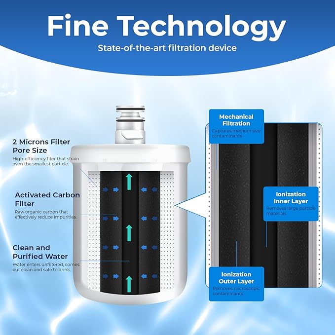 - Filtration Process: The filter material in this filter is a selected coconut shell carbon block, with 2x larger surface area and more micropores. The water passes through the pores of the filter, The water is further purified through two separate stages of ionization filtration that take place as the water passes through the carbon block to your refrigerator. The filter material in the Pureline refrigerator filter improves the overall taste of your water Unlike the cheap and mixed carbon block.