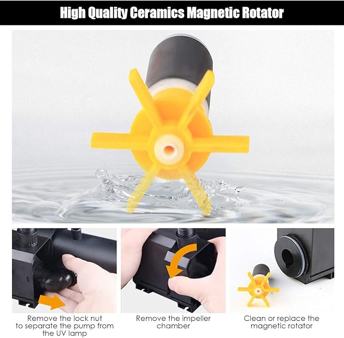 - 【4 in 1 Pond Filter System】In addition to the fountain, filtering and lamp, this water pump also has a pumping function. It is worth mentioning that this pump is equipped with a regulating valve for regulating flow to fountain head and/or auxiliary water. Strong and magnetic ceramic rotator ensures strong and energy efficiency.