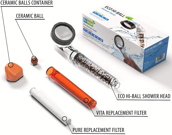 - Built-in Purifying Water Filer - The Eco Hi-Ball Shower Head removes 99.9% of residual chlorine from your local water. No more rust, foreign substances, or floating matter. Forget lead, chromium, iron and heavy metals. The purest way to shower. Your skin and hair will thank you.