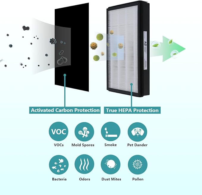 - A2 True HEPA filter captures up to 99.97% of particles as small as 0.1 microns in size from your indoor air such as allergen, mold spores, pollen, lint, household dust, pets dander.