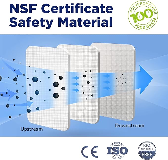 - [MATERIAL SAFETY] - Made from 100% food-grade polypropylene, free of lead and BPA. Certified by NSF International to meet NSF/ANSI Standard 42 for material safety. The unique melt-blown technology ensures no fibers shed, preventing re-contamination of your drinking water. Keep your family safer and healthier every day.