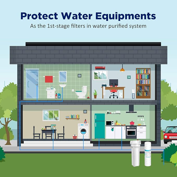 - PROTECT WATER EQUIPMENT: This filter removes up to 99% of sediment, including rusts, silt, sand, and other undissolved particulates from feedwater. As the first-stage filter in the whole house filtration system, it protects your post-filters, water appliances, pipes, bathroom, and kitchen faucets and shower fittings from clogging, providing a healthier filtered water supply for your home.