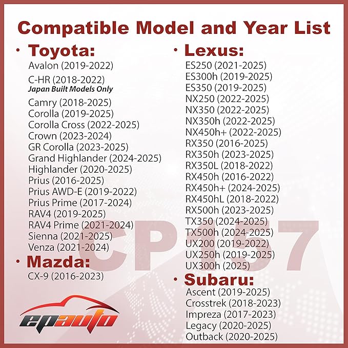 - Compatible with Toyota Avalon (2019-2022), C-HR (Japan Built Models Only)(2018-2022), Camry (2018-2025), Corolla (2019-2025), Corolla Cross (2022-2025), Crown (2023-2024), GR Corolla (2023-2025), Grand Highlander (2024-2025), Highlander (2020-2025), Prius (2016-2025), Prius AWD-E (2019-2022), Prius Prime (2017-2024), RAV4 (2019-2025), RAV4 Prime (2021-2024), Sienna (2021-2025), Venza (2021-2024)