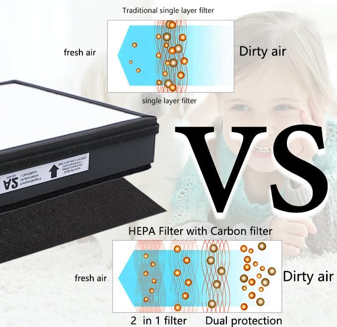 - 【PREMIUM HEPA】- True HEPA filter effectively captures up to 99.97% of airborne particles from your indoor air such as dust & lint, dust mites debris, mold spores & pollen, pet dander, PM 2.5 & exhaust particles and more.