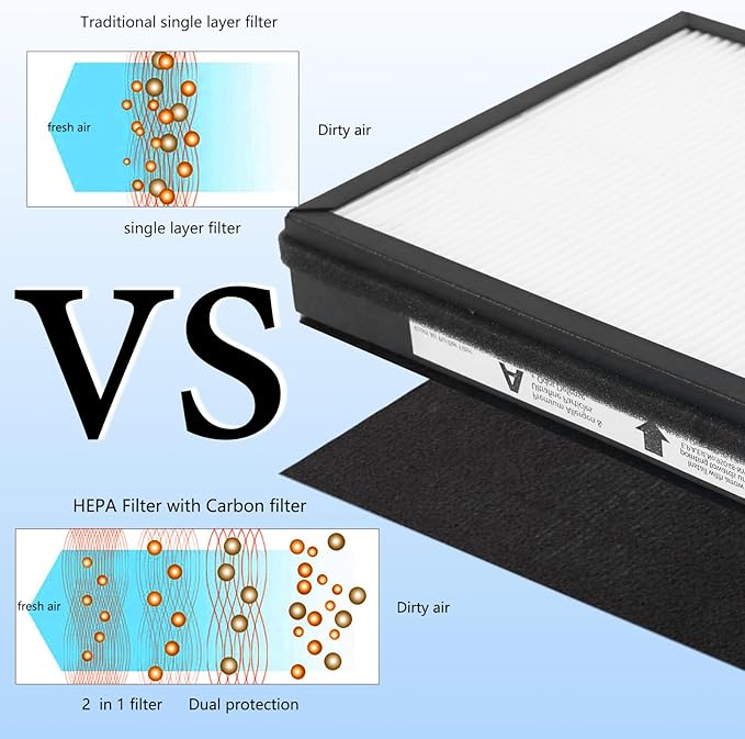 - 【SPECIFICATIONS】- Product Dimension: W:7.8xL:9.8xH:1.4 inches, Package of 2 HEPA A size Filters + 2 Carbon Pre-Filters. Recommended the replace every 12 months or depends on usage.