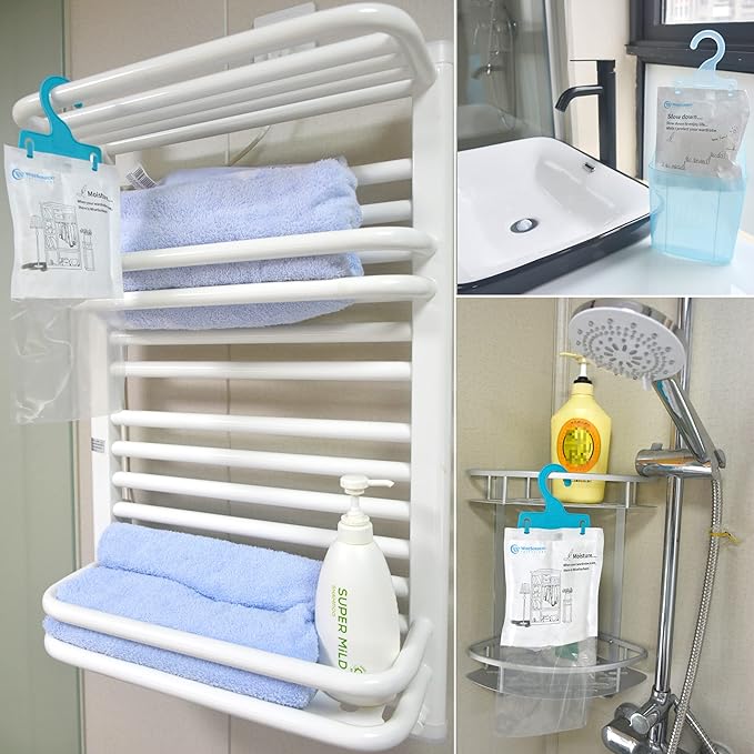 - 【Easy and Safe to Use】: Hang the moisture absorbing bags freely. Moisture absorber Hanging bags collect much humidity in your closet, wardrobes, basement, laundry room, household, bathroom, kitchen, shoe cabinet, car, cat's litter box, camper.