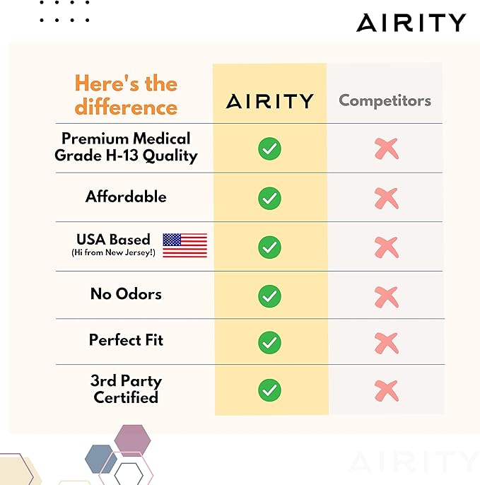 - π£π₯ππ ππ¨π π ππππππ ππ₯πππ π€π¨ππππ§π¬ β Airity HEPA 13 / MERV 17 filters are a premium medical grade quality Type R Hepa Filter. Combined with the Airity activated carbon prefilters, you can breathe easy knowing your home has cleaner and fresher air.