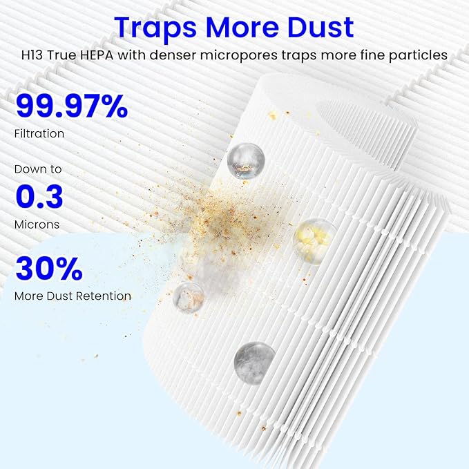 - H13 True HEPA Filtration: Made with dense PET microstructure material, this HEPA filter captures 30% more dust than standard PP filters for longer-lasting performance. It removes 99.97% of airborne particles as small as 0.3 microns, including dust, pollen, pet dander, and smoke particles
