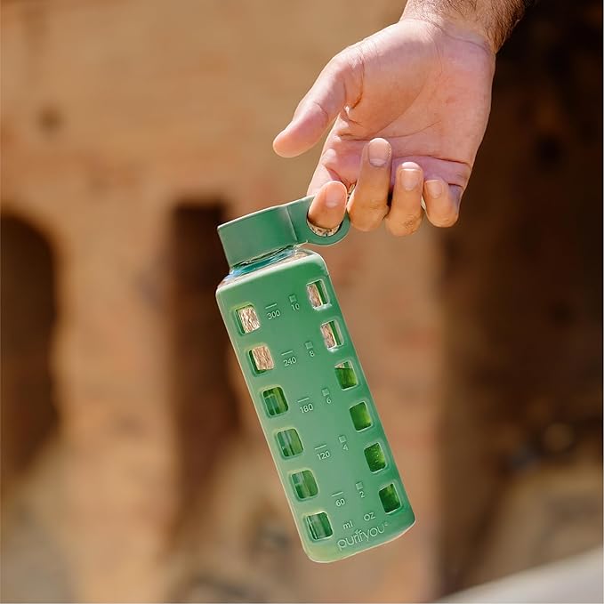 - Track & Improve Daily Hydration: Stay on top of your water goals with purifyou glass water bottles featuring clear, easy-to-read time and volume markings. Perfect for workouts, travel, the office, or relaxing at home.