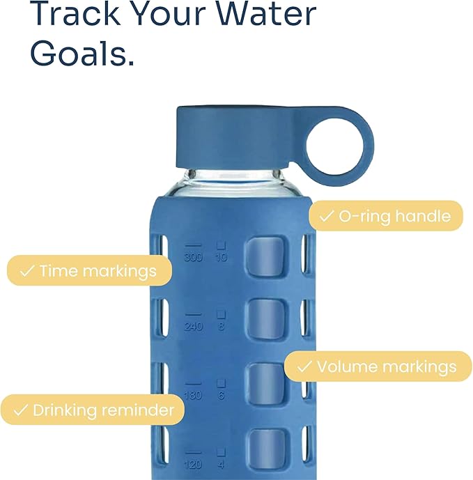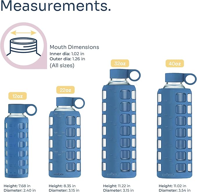 - Track & Improve Daily Hydration: Stay on top of your water goals with purifyou glass water bottles featuring clear, easy-to-read time and volume markings. Perfect for workouts, travel, the office, or relaxing at home.
