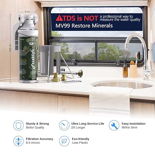 - [Certified Trusted Water] Frizzlife MV99 Lead Free RV water filter system is certified by IAPMO R&T against NSF/ANSI 42&53. With TOP TIER composite activated carbon block at 0.5 micron filtration accuracy, the water purifier can reduce Chlorine, Sediments, Lead & Other Heavy Metals, Bad Taste & Odors, and other harmful contaminants from water while leaving in essential minerals, ensuring much safer and better tasting water for your outdoor usage.