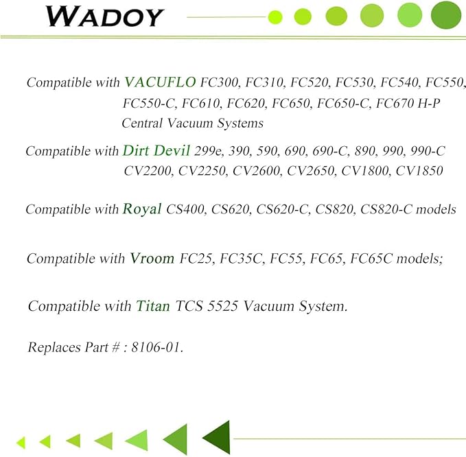 - Works with - 7 Inch Cartridge Filter Compatible with Dirt Devil, Vacuflo, Vroom,Titan, Royal Central Vacuum Systems, Replacement Part # 8106-01