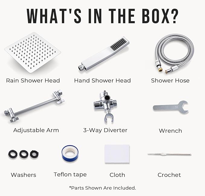 - ►PACKAGE INCLUDES: Rainfall shower head, handheld shower head, shower extension arm, shower hose, shower diverter and accessories