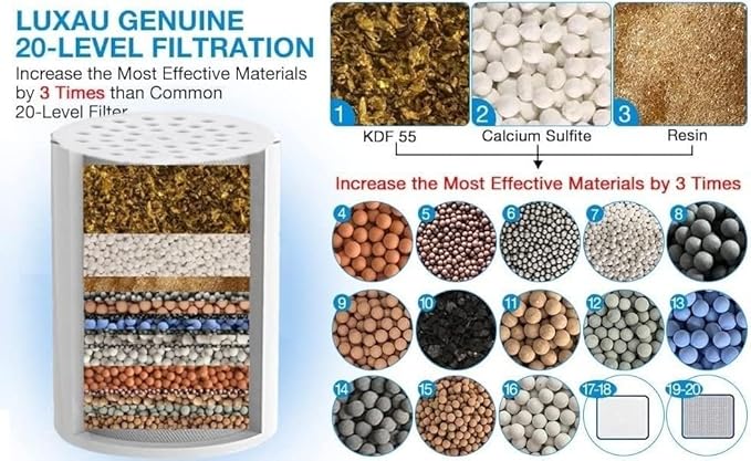 - 【The Genuine 20-Stage Filtration】 our 20- stage filter cartridge increases the most effective filtration media (KDF 55, Calcium Sulfite, Resin) by 3 Times than Other Brand 20-Stage Filter on the market, while also Adds 5 New Filtration Media (Zeolite, Selenium-Enriched Ball, Tourmaline, Porous Ceramic Ball, Small Molecule Ball), to Achieve More Effective and Better Filtration in both hot and cold water, while also no blocking, no change in water pressure.
